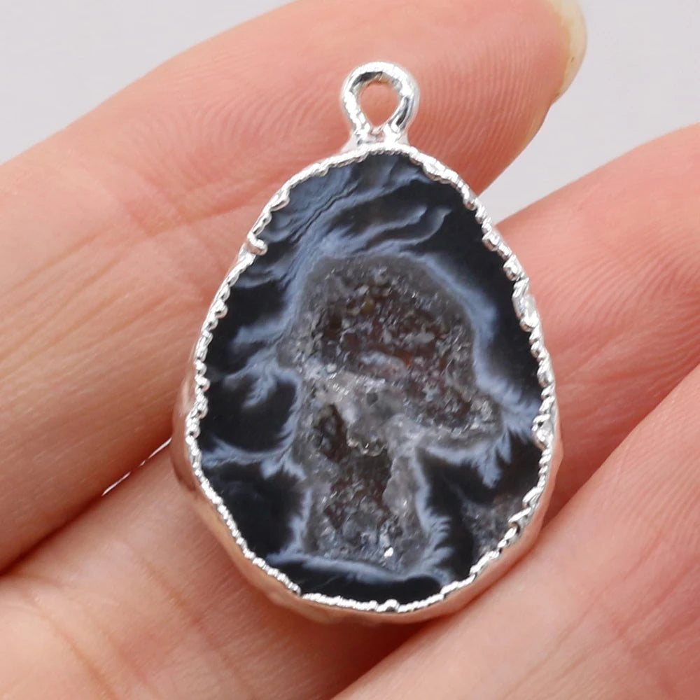 Natural Irregular Black Druzy Agate Silver-Plated Pendant
